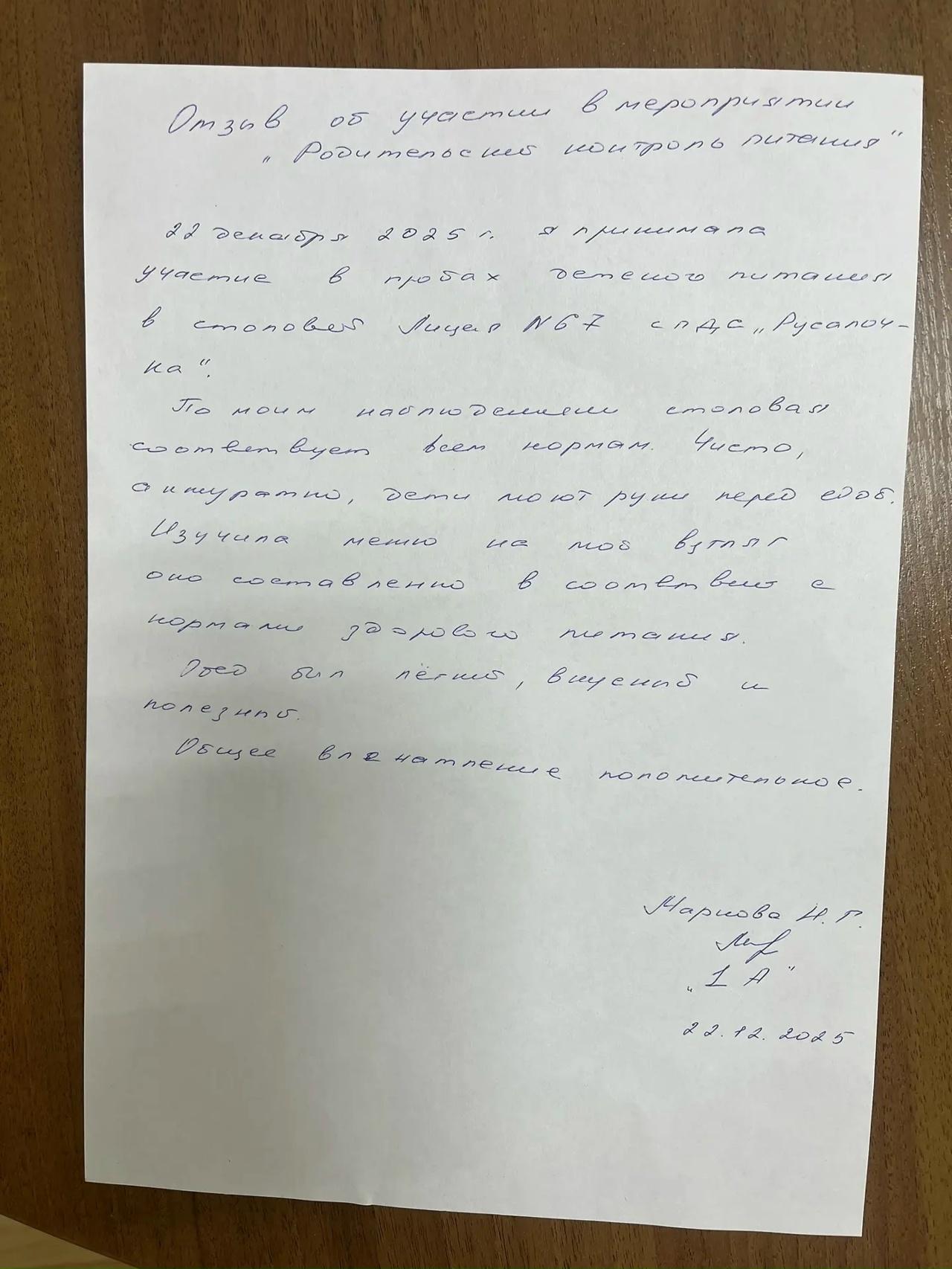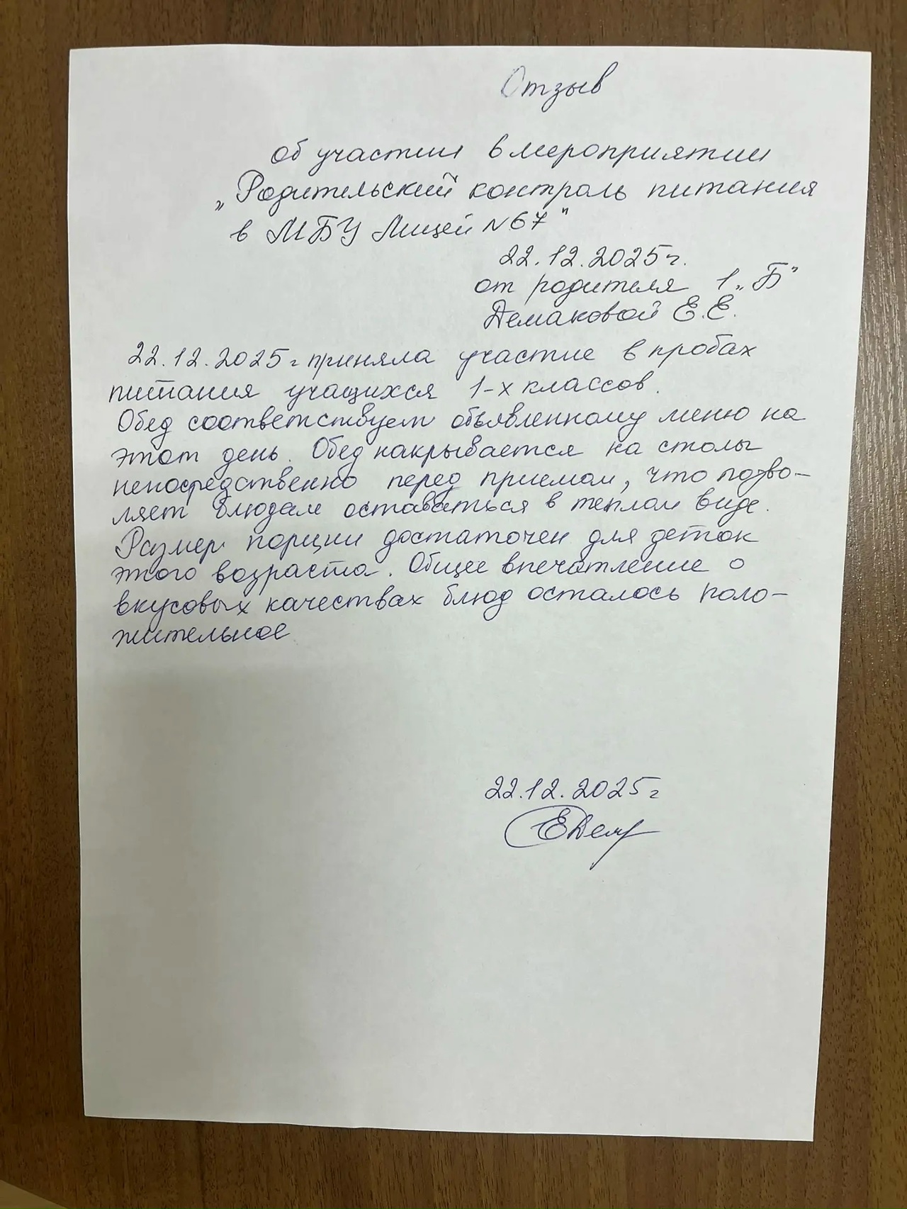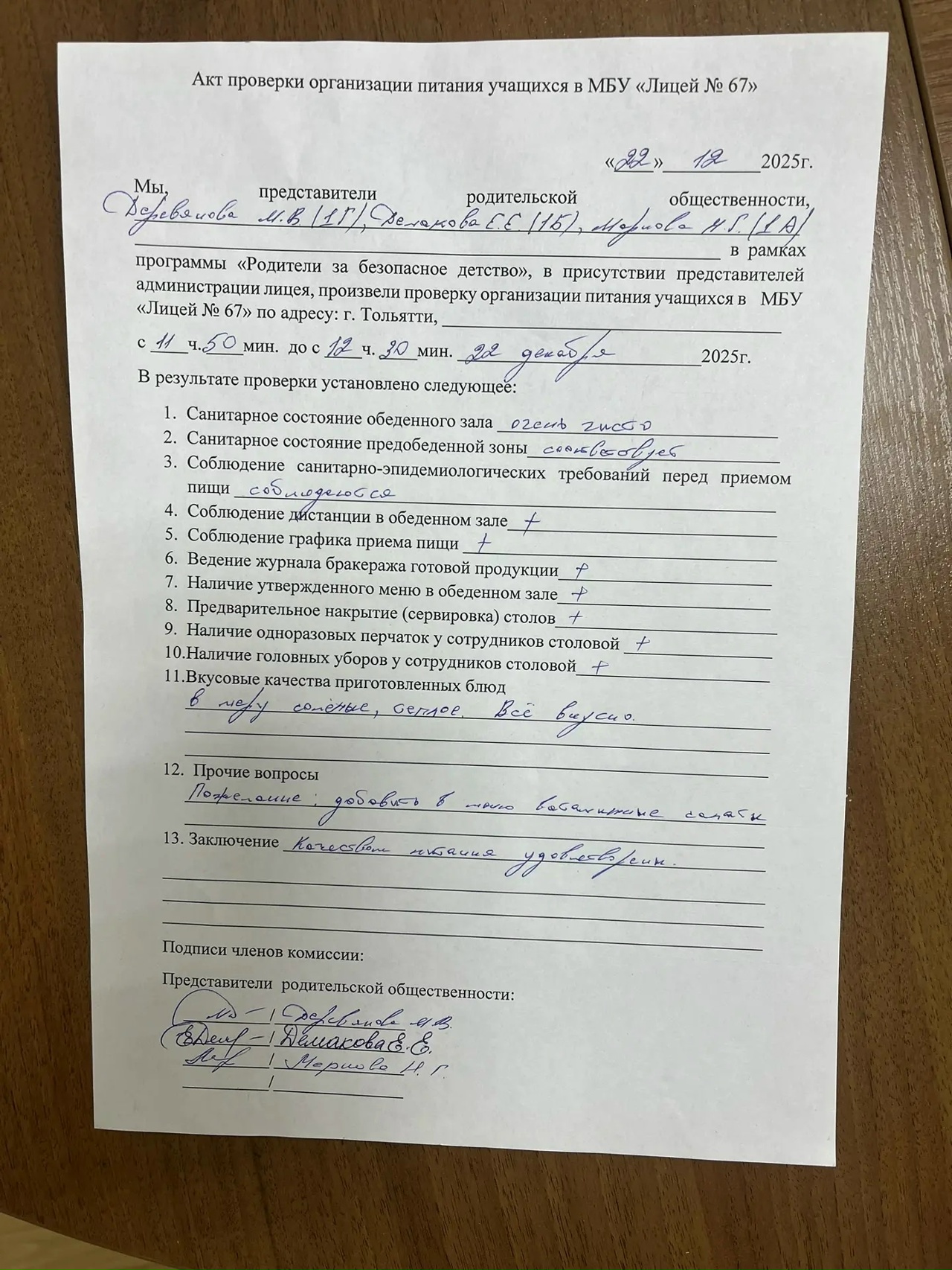 Мероприятия с участием родительской общественности: Родители – ЗА безопасное детство! В понедельник, 22 декабря 2025г., в МБУ «Лицей67» прошел Родительский контроль питания 1 классов в школьной столовой с/п д/с «Русалочка». Активные родители учеников первых классов посетили 67 лицей, чтобы снять пробу обедов и оценить уровень организации предоставления горячего питания в школьной столовой. Родители 1А,1Б и 1Г классов изучили меню, сняли пробу, побеседовали с администрацией лицея и представителем ЗАО КШП «Дружба» зав. производством Гуляевой Н. Г., заполнили акт проведения контроля и написали об’ективные отзывы, которые размещаем ниже. В пятницу, 28 ноября 2025г., в МБУ «Лицей67» прошел очередной Родительский контроль питания. Активные мамы-представители родителей учеников вторых классов, посетили школьную столовую, чтобы снять пробу завтраков, поприсутствовать на приеме питания своих детей и оценить уровень организации предоставления горячего питания в лицее. Представительницы родительской общественности изучили меню, сняли пробу, пообщались с ребятами на предмет удовлетворенности завтраком, побеседовали с администрацией лицея и представителем ЗАО КШП «Дружба» зав. производством Якубович Г.В., заполнили анкету и написали объективные отзывы, которые размещаем ниже. Хочется разместить отзыв который, пообщавшись с своей дочерью на предмет удовлетворенности питанием в школьной столовой, оставила родитель 3А класса. Эта мама не была участницей родительского контроля питания, однако, она часто беседует со своим ребенком, интересуется ее мнение и настроением. После очередного общения с дочерью Ахметова Л.Х. Выразила благодарность всем работникам столовой и лично заведующей производством Галине Валерьевне. Отзыв размещаем ниже.