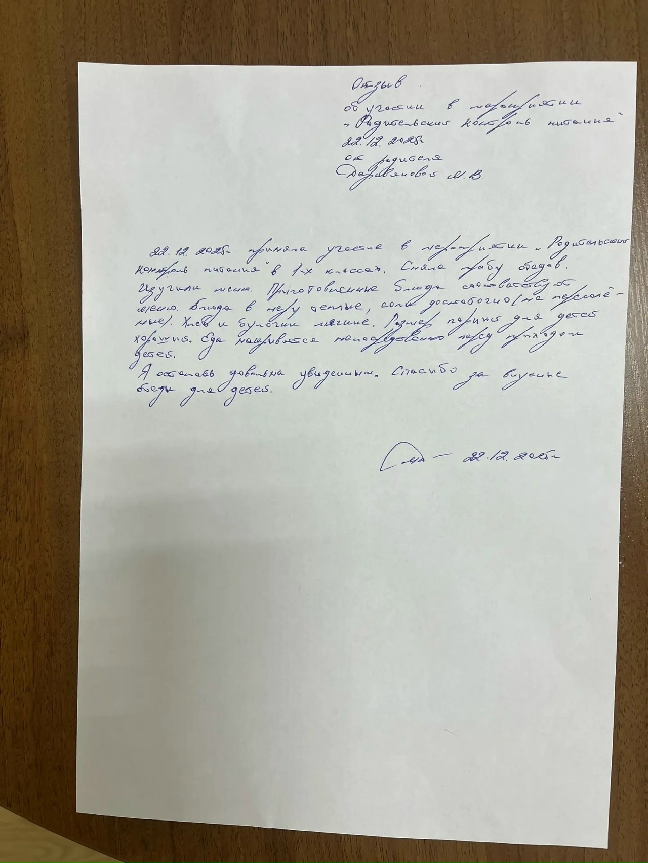 Ранее, 19 октября 2022 г., по собственной инициативе, школьную столовую посетила представитель родительской общественности 7 «Б» класса. Она сняла пробу, проверила соответствие блюд меню и также написала положительный отзыв по результатам контроля.